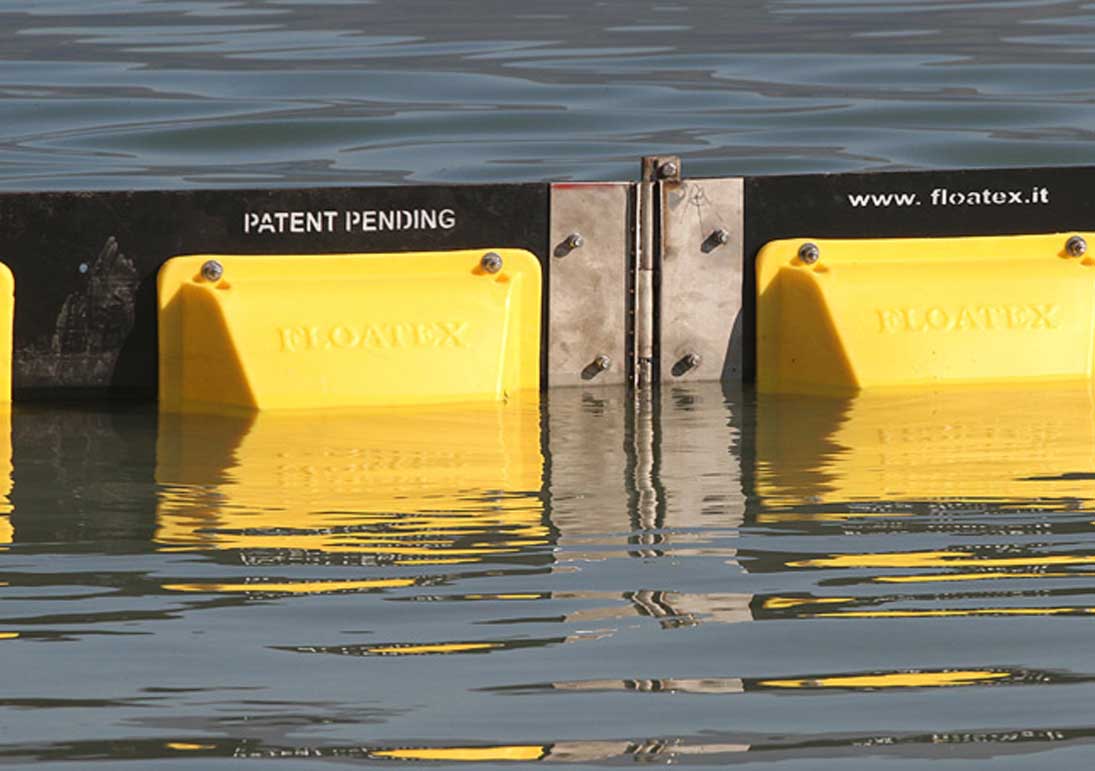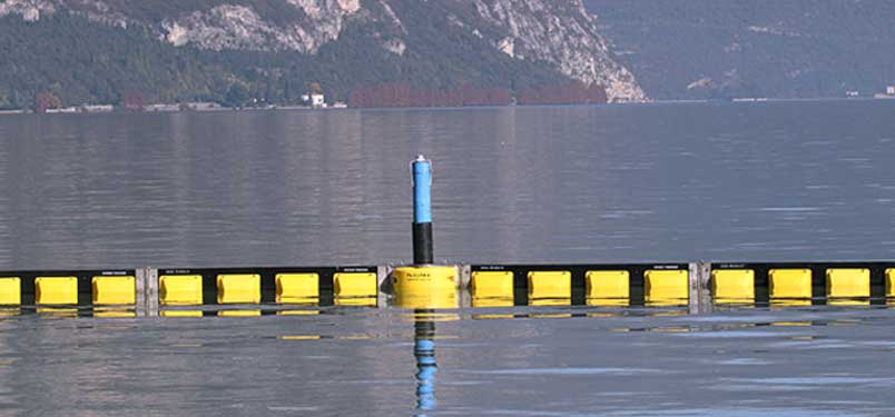 The lower part of the sheet submerged is ballasted with lead loads applied by means of stainless steel bolts, to guaranty the verticality and stability to the boom.