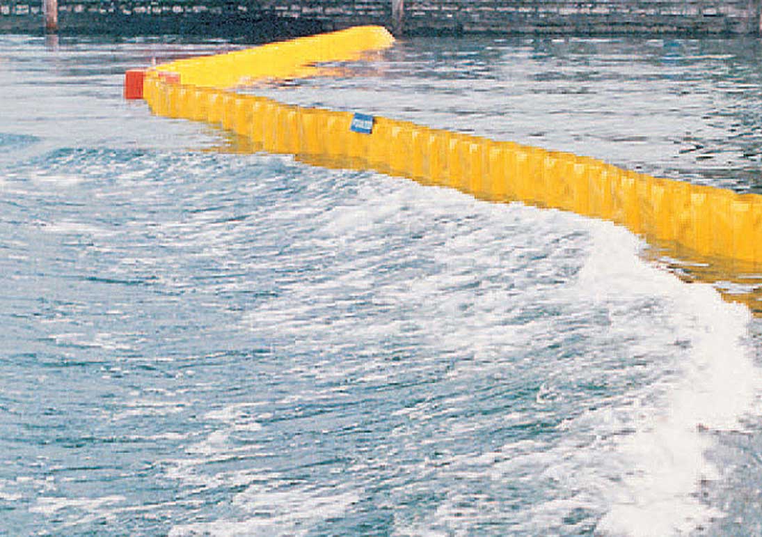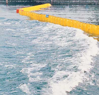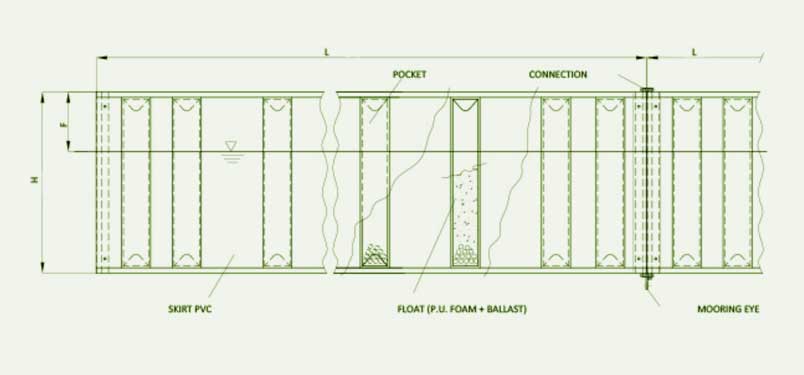 The floatation modules, with moulded-in ballast, are fitted into vertical pockets in the skirt, their rigidity ensuring the vertical stability of the barrier.