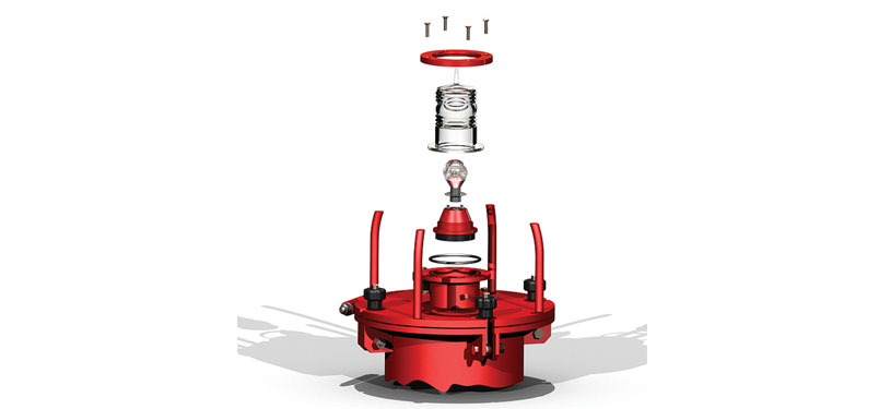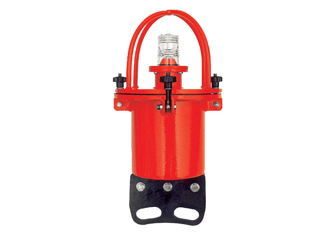 The WL60 winkerlight is available in two configurations, tall and short, and has been designed as a special signalling device easy to mount on the flanges of floating sealines. A set of opposite attachments allows to fix the lantern body to the flange of any hose diameter. Two different models can be offered by FLOATEX one with tubular battery container and high focal plane or another with box type battery container and lower focal plane. It is up to the user to make a choice between these two types according to the distance of mooring cables floating in the vicinity of the installation. To reduce the minimum for battery replacement to a minimum, FLOATEX has designed this type of light signal with a considerable working autonomy, and with a sturdy solid structure. An electronic circuit ensures low consumption even in proportion to the light range of 1 nm, whereas the use of high-thickness shot blasted and galvanized steel structure provides for suitable resistance. The winkerlight WL60 type for floating lines basically consist of three sections: - Top steel plate complete with bow for lantern protection - Tubular section (battery container) ending at the top with a flange provided with a gasket, complete with locking bolts which fixes the top flange to insure watertightness - A special semi circular steel piece with eyelet holes and different diameters suited for the hose on which to mount the lantern, providesfor connection between the lantern and the flange of the floating line to be marked. All hardware shot blasted to white metal, hot-dipped galvanized and PU marine painted to the required colour.